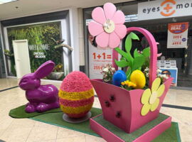 Dabei werden Frühlinsdekorationen mit Osterdekorationen gemischt. Highlight sind die Fiberglas-Figuren wie Hasen und Küken, die oft von den Besuchern fotografiert werden. Alle Deko-Elemente sind so auf dem Fussboden fest verankert, so dass sie standfest und sicher am Platz stehen. Die gesamte Dekoration stellt Berger Easter Decoration dem Kunden zur Miete zur Verfügung.